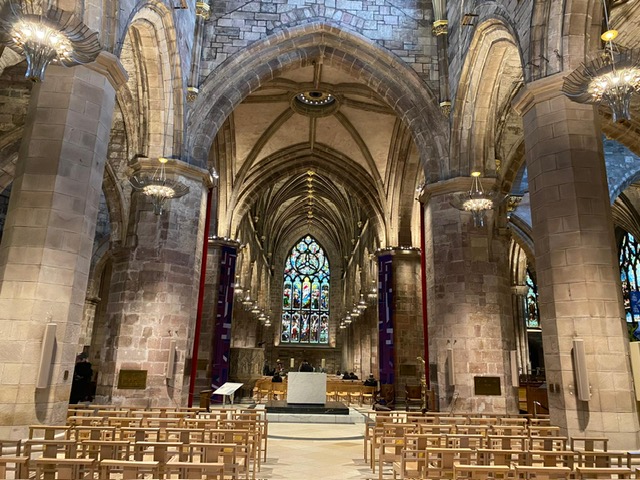 tories abounded about figures like Mary Queen of Scots and Bonnie Prince Charlie and it was here that the body of Queen Elizabeth II lay in state for a night before being transferred to nearby St Giles Cathedral and then flown to London in September 2022. The Scottish Parliament, a modern building inaugurated in 2004, is located just across the road from Holyroodhouse Palace and was visited by some of our group. Apart from a security check there is easy access to the building which has a gift shop and nice café.
