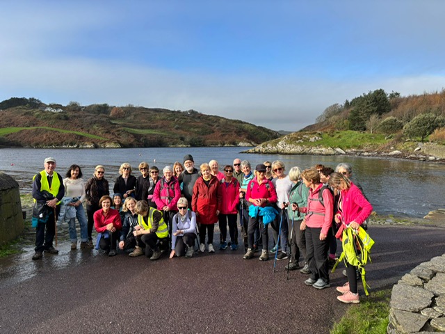 30 RTAI members gathered at the Celtic Ross Hotel to be greeted by Seán McCarthy who was our leader. A quick pop into the hotel saw some of us almost recruited for a large Lisavaird Co-op function. With the sun now at full glow outside we made our excuses and left. We struck out to enjoy the best views of Rosscarbery with a special visit to the very pretty Mill Cove. As the tide was well in we we looked over the vast expanse of water towards the Warren Strand. Alas, amid such outstanding beauty, Seán told us of some heartbreaking drownings that invest the scenery with remembered pain and loss. Seán McCarthy’s deep knowledge of where we walked was twinned with a wisdom not to overburden his listeners so we moved steadily on. We left the tranquility of Mill Cove reluctantly and climbed onwards to Coppinger’s Court west of Rosscarbery. It is quite a sight in ruins, standing lonely in a huge field. It has been thus enduring for hundreds of years. Likewise the bad character of its builder, Sir Walter Coppinger, remains fresh in local memory.
